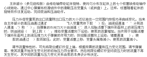 軸向柱塞泵是采用配油盤配油,缸體旋轉,靠變量頭變量的斜盤式軸向柱塞泵。該泵采用液壓靜力平衡的最佳油膜厚度設計,使缸體與配油盤、滑靴與變量頭之間處于純液體摩擦下運轉,具有結構簡單、體積小、噪音低、效率高、壽命長和有自吸能力等優點。